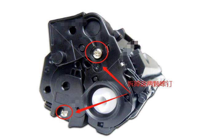2、然后用十字螺絲刀拆掉硒鼓側面的兩顆螺釘,如圖所: