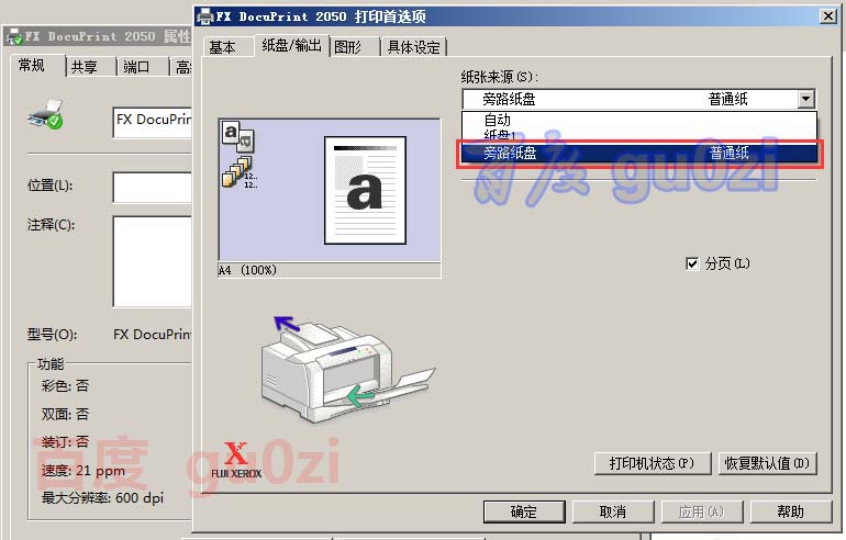7、我們可以通過屬性對默認進紙先設定一下。如果不是經常打印可設定為旁路進紙,需要時再放紙比較方便。