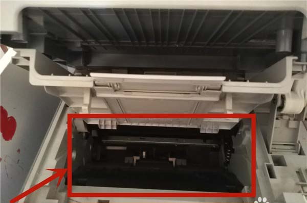 3、將打印機(jī)斷電,可以拔下電源線,也可以長按電源鍵。在圖示處向上掀起打印機(jī)上蓋,露出打印機(jī)出紙板。