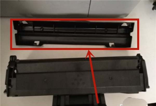 2、將粉盒裝入打印機(jī)之前,要記得把硒鼓保護(hù)蓋卸下。方法:沒有螺絲,順著開口方向(圖中箭頭方向)兩端同時用力拉動即可直接取下。