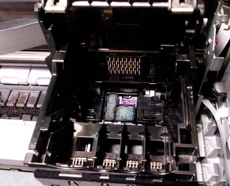 1、首先將打印機中的墨盒拆下來,會發現墨盒底部有類似集成電路的部分