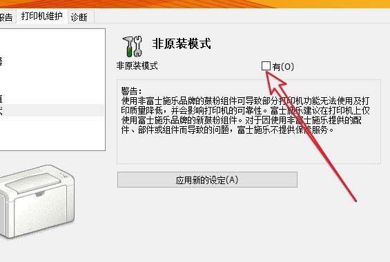 7、在右側打開的窗口中,我們找到“非原裝模式”設置項,選中后面“有”前面的復選框,最后點擊確定按鈕即可。這樣我們的打印機就可以正常打印文檔了。