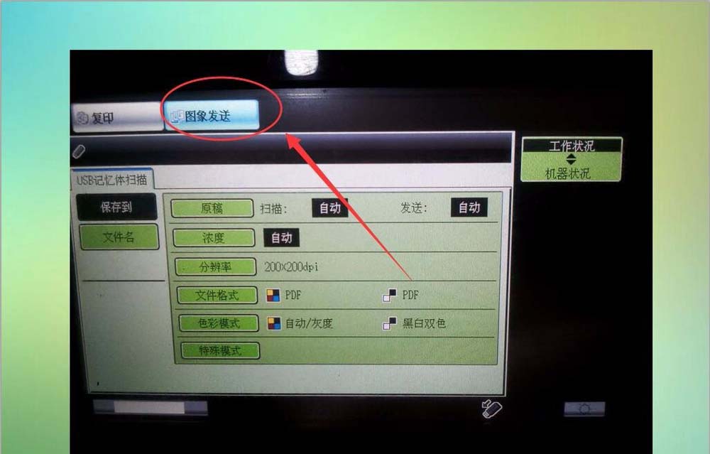 2、打印機(jī)的屏幕最上方會(huì)有“復(fù)印”與“圖像發(fā)送”,點(diǎn)擊“圖像發(fā)送”。