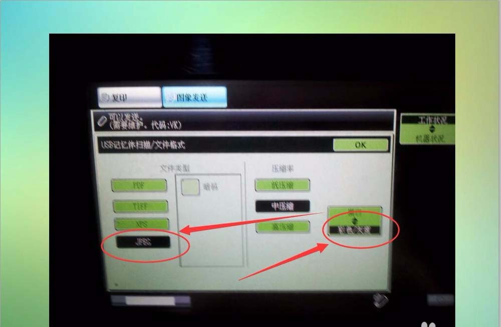 4、掃描前需要設(shè)置文件格式。文件格式的設(shè)置首先要設(shè)置掃描文件為彩色(在右面),然后會(huì)顯示文件JPG的格式,點(diǎn)擊選擇JPG,點(diǎn)擊OK。如果不選擇彩色是不會(huì)顯示JPG格式選項(xiàng)的。