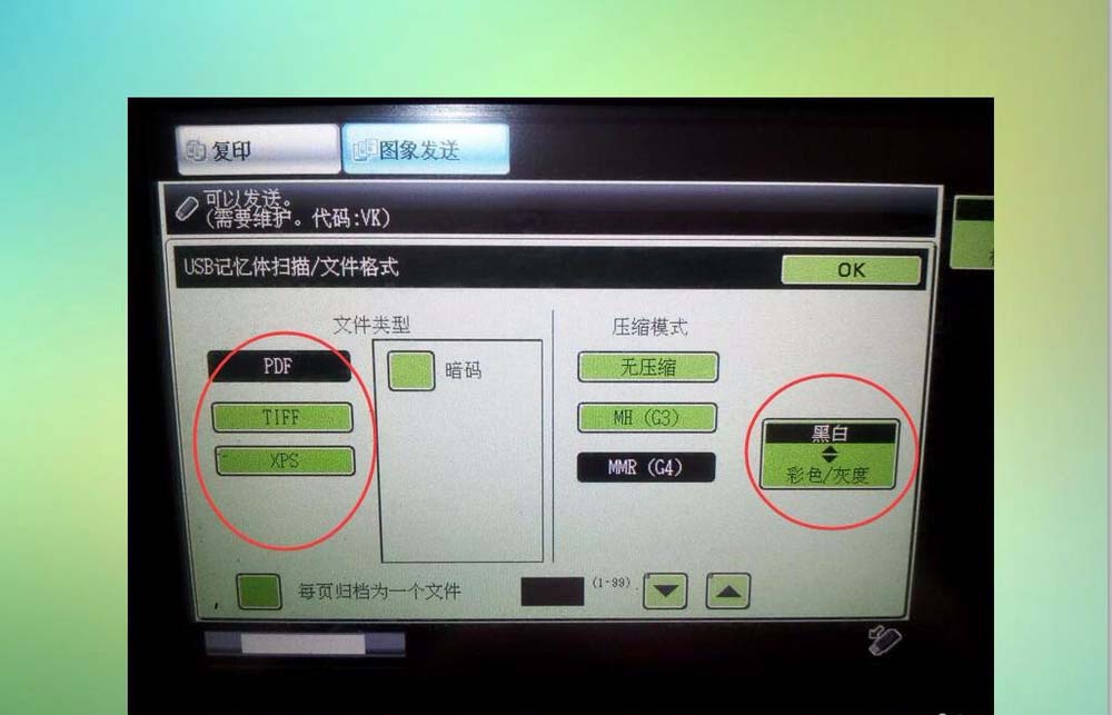 5、將文件放到掃描的位置,紙張的大小根據(jù)自己的要求,一般都是放到A4的位置上進(jìn)行掃描。按下右面的圓形按鈕(彩色圖像發(fā)送)進(jìn)行圖像發(fā)送到U盤,下面的按鈕發(fā)送的是黑白的,具體根據(jù)自己的要求操作。