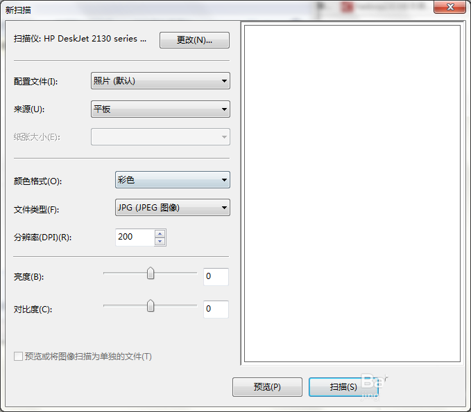 3、右鍵HP DJ 2310 series--->點擊開始掃描得到如下掃描配置界面,默認就行,也可以根據自己需求選擇參數。