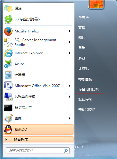 1、打開開始按鈕,在開始菜單中找到設備和打印機功能。
