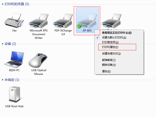 2、在打開的窗口中,找到連接好的打印機設備,右擊選擇打印機屬性。