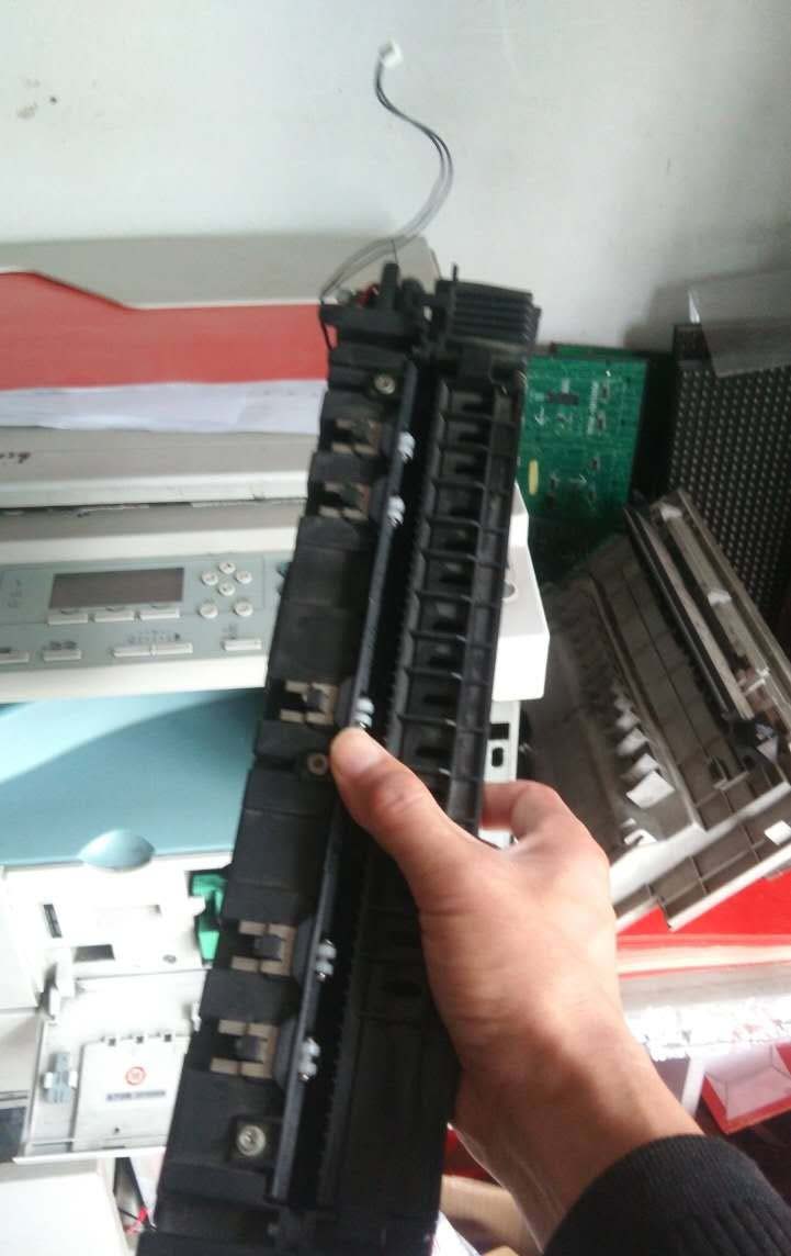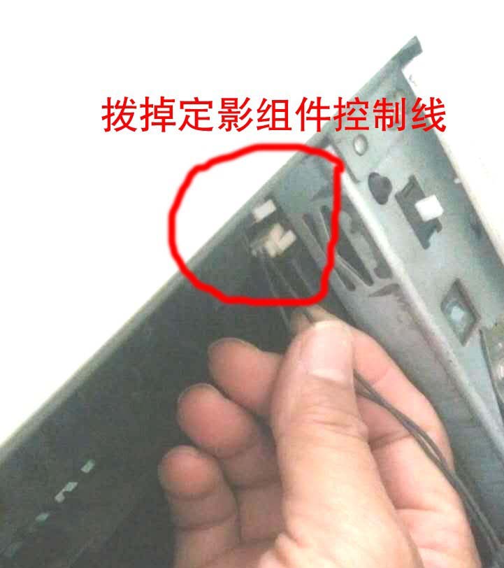 8、發現有兩線帶著定影件,(紅圈內),用力撥下它。整個定影件就可拿出來了。