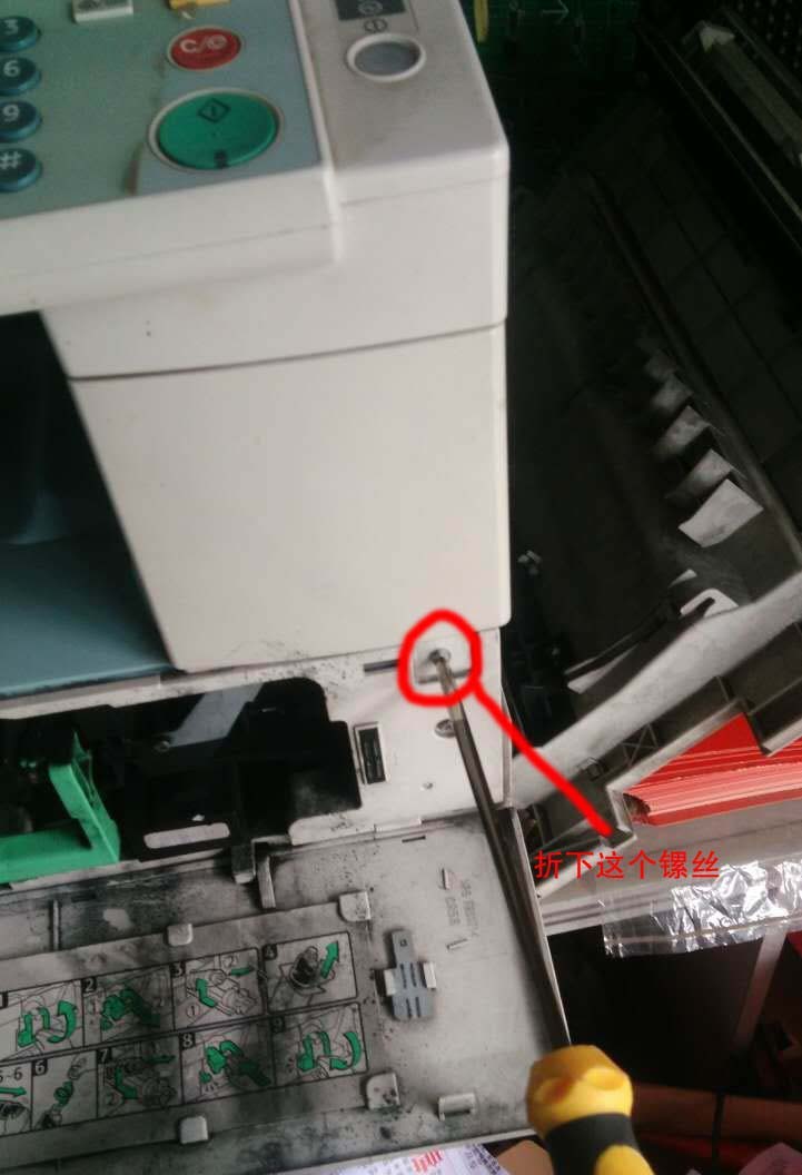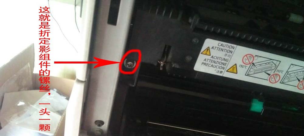 2、找到定影組件,下面看看怎么折了,定影組件一般有兩鏍絲,一頭一顆。用鏍絲刀折下兩顆鏍絲。