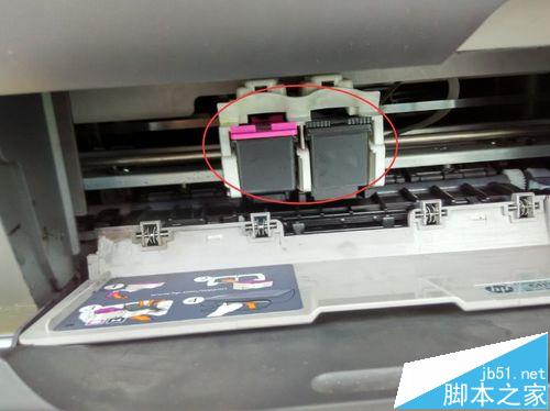 2、打開(kāi)白色的墨盒檔蓋,如圖中畫(huà)圈處往外扳開(kāi);此時(shí)看到墨盒架隱藏在了左側(cè)角落處