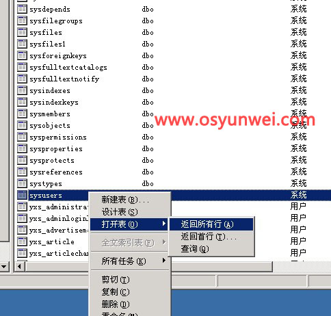 4.展開數據庫,看到數據庫系統表 sysusers ,右鍵--打開表--返回所有行: