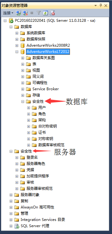 插圖1.2:在對象瀏覽器里,在服務器和數據庫級別的安全對象