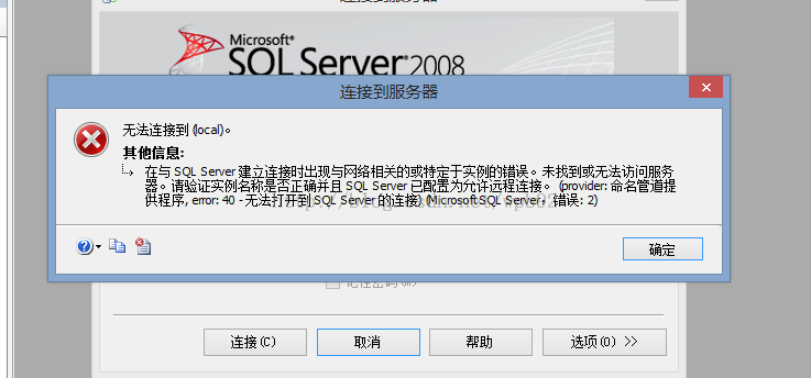 但是,當自己打開之前敲的系統時,總是報錯,無法進行。經過檢查發現,原來是自己的數據庫出現了問題,無法連接到數據庫了。打開Sql Server2008,總是報這樣的錯誤提示: