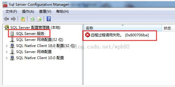 這里邊本來該有很多項內容的,可是這里不知道為何提示遠程過程調用失敗。沒辦法,只能再次上網查找信息了。很多人都問了類似的問題,有的說只能重新安裝,也有的說直接裝系統。看著別人都是問問題,而沒有人能夠給出解決方法,說實話,當時心就涼了半截啊。不過,還好耐著性子找了下去,有個解決方法就是卸載SQL server中的一個軟件