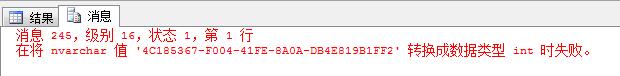 一開始拉取的數據并未有GUID的值,都是INT類型轉換過來的數據,所以SQL腳本運行的正常,但是突然某一次運行時,出現了“在將 nvarchar 值 '4C185367-F004-41FE-8A0A-DB4E819B1FF2' 轉換成數據類型 int 時失敗。”的錯誤。如下圖所示: