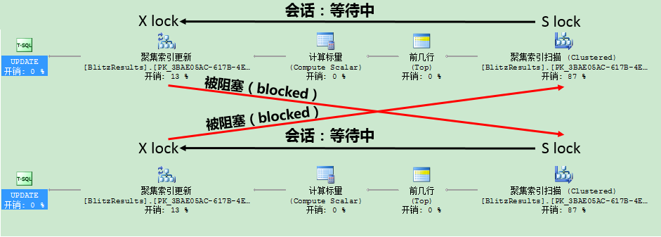 在第1階段不獲得更新鎖,在這個階段直接獲得排它鎖也是可見選項。這會克服死鎖問題,因為排它鎖與另一個排它鎖不兼容。但這個方法的問題是并發受限制,因為同時沒有其他的SELECT查詢可以讀取當前有排它鎖的數據。因此需要更新鎖,因為這個特定鎖與傳統的共享鎖兼容。這樣的話其他的SELECT查詢可以讀取數據,只要這個更新鎖還沒轉化為排它鎖。作為副作用,這會提高我們并發運行查詢的并發性。