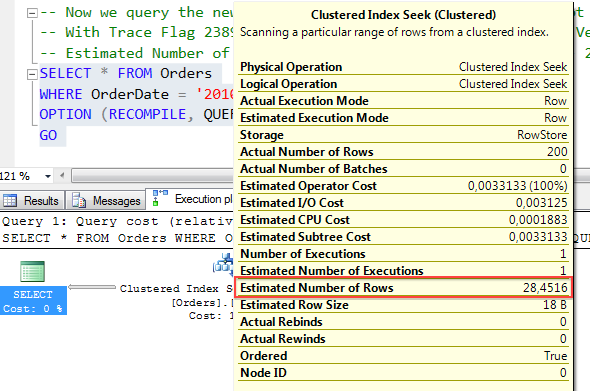 1 -- With the new Cardinality Estimator SQL Server estimates 28.4516 rows at the Clustered Index Seek operator.2 SELECT * FROM Orders3 WHERE OrderDate = '20100401'4 OPTION (RECOMPILE, QUERYTRACEON 2312)5 GO
