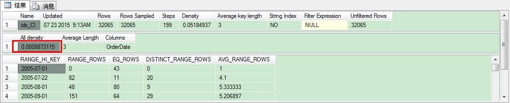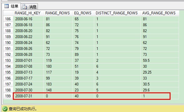 -- Create a simple orders table CREATE TABLE Orders ( OrderDate DATE NOT NULL, Col2 INT NOT NULL, Col3 INT NOT NULL ) GO -- Create a Non-Unique Clustered Index on the table CREATE CLUSTERED INDEX idx_CI ON Orders(OrderDate) GO -- Insert 31465 rows from the AdventureWorks2008r2 database INSERT INTO Orders (OrderDate, Col2, Col3) SELECT OrderDate, CustomerID, TerritoryID FROM AdventureWorks2008R2.Sales.SalesOrderHeader GO -- Rebuild the Clustered Index, so that we get fresh statistics. -- The last value in the Histogram is 2008-07-31. ALTER INDEX idx_CI ON Orders REBUILD GO -- Insert 200 additional rows *after* the last step in the Histogram INSERT INTO Orders (OrderDate, Col2, Col3) VALUES ('20100101', 1, 1) GO 200在索引重建后,我們?cè)倏聪轮狈綀D,我們發(fā)現(xiàn)最后步進(jìn)的值是2008-07-31。