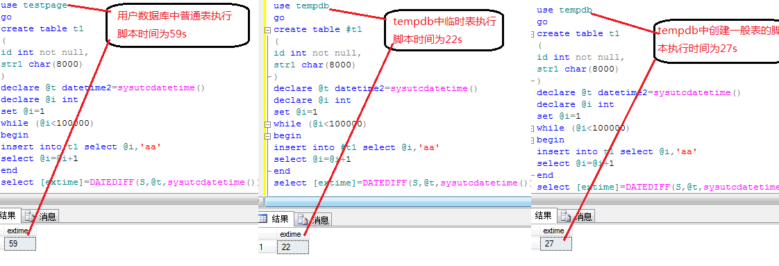 我們分別在用戶數據庫(testpage),tempdb中創建相似對象t1,#t1,并在tempdb中創建創建非臨時表,然后執行相應的insert腳本(用以產生日志),并記錄執行時間用以比較用以比較說明tempdb”快”