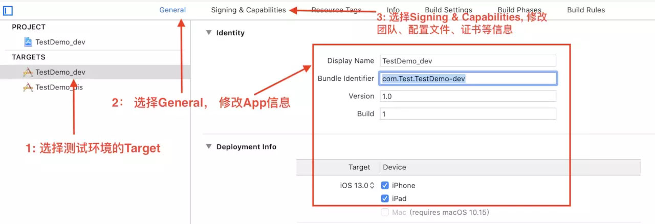 (1)更改測試環境下的General 和 Signing & Capabilities 中的信息