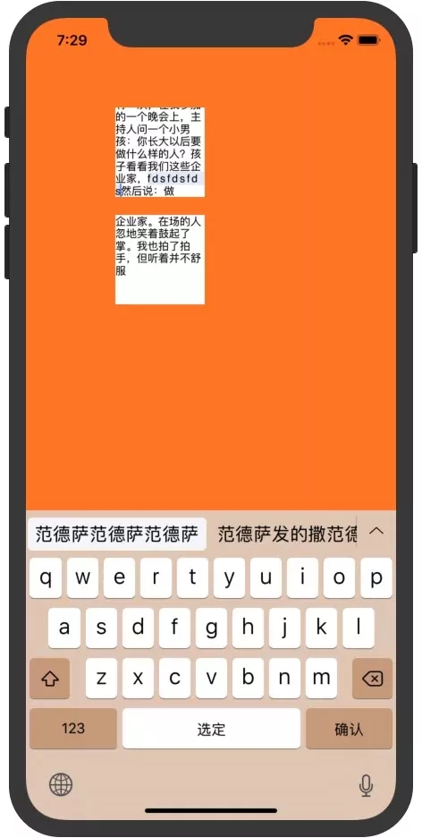 - (void)handleBelowTextViewWithAboveTextView:(UITextView *)textView totalText:(NSString *)textViewText { NSInteger sectionIndex = textView.tag - kMarkTag; // 判斷是否已存在下一視圖 UITextView *belowTextView = [self.scView viewWithTag:kMarkTag + sectionIndex + 1]; if (belowTextView) { // 原有的文本添加到后面 NSString *oriText = belowTextView.text; NSMutableString *mString = [[NSMutableString alloc] initWithString:textViewText]; [mString appendString:oriText]; belowTextView.text = mString.copy; } else { belowTextView = [self contentTextViewWithIndex:++sectionIndex]; belowTextView.text = textViewText; } [self.scView addSubview:belowTextView]; self.scView.contentSize = CGSizeMake(self.scView.bounds.size.width, CGRectGetMaxY(belowTextView.frame)); CGFloat realBelowHeight = [belowTextView sizeThatFits:CGSizeMake(CGRectGetWidth(belowTextView.bounds), MAXFLOAT)].height; if (realBelowHeight <= belowTextView.bounds.size.height) { [belowTextView becomeFirstResponder]; return; } belowTextView.textContainer.size = belowTextView.bounds.size; NSRange range = [belowTextView.layoutManager glyphRangeForTextContainer:belowTextView.textContainer]; NSString *currentTmpBelowText = belowTextView.text; belowTextView.text = [currentTmpBelowText substringWithRange:range]; NSString *remainText = [currentTmpBelowText substringFromIndex:belowTextView.text.length]; // 再次執行方法,直到沒有多余文本 [self handleBelowTextViewWithAboveTextView:belowTextView totalText:remainText];}