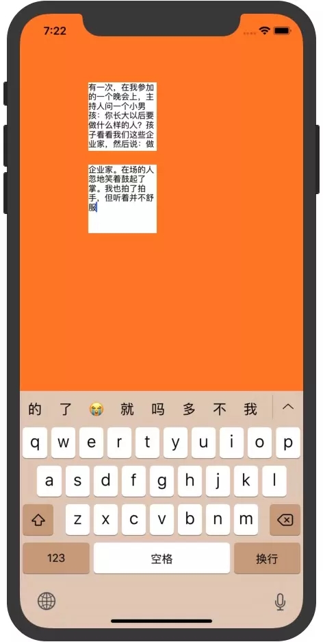 NSString *text = @"有一次,在我參加的一個晚會上,主持人問一個小男孩:你長大以后要做什么樣的人?孩子看看我們這些企業家,然后說:做企業家。在場的人忽地笑著鼓起了掌。我也拍了拍手,但聽著并不舒服。我想,這孩子對于企業究竟知道多少呢?他是不是因為當著我們的面才說要當企業家的呢?他是不是受了大人的影響,以為企業家風光,都是有錢的人,才要當企業家的呢/n這一切當然都是一個謎。但不管怎樣,作為一個人的人生志向,我以為當什么并不重要;不管是誰,最重要的是從小要立志做一個努力的人/n我小的時候也曾有人問過同樣的問題,我的回答不外乎當教師、解放軍和科學家之類。時光一晃流走了二十多年,當年的孩子,如今已是四十出頭的大人。但仔細想一想,當年我在大人們跟前表白過的志向,實際一個也沒有實現。我身邊的其他人差不多也是如此。有的想當教師,后來卻成了個體戶;想當解放軍的,有人竟做了囚犯。我上大學時有兩個同窗好友,他們現在都是我國電子行業里才華出眾的人,一個成長為“康佳”集團的老總,一個領導著TCL集團。我們三個不期而然地成為中國彩電骨干企業的經營者,可是當年大學畢業時,無論有多大的想像力,我們也不敢想十幾年后會成現在的樣子。一切都是我們在奮斗中見機行事,一步一步努力得來的。與其說我們是有理想的人,不如說我們是一直在努力的人。/n并非我們不重視理想,而是因為樹雄心壯志易,為理想努力難,人生自古就如此。有誰會想到,十多年前的今天,我曾是一個在街頭彷徨,為生存犯愁的人?當時的我,一無所有,前途渺茫,真不知路在何處。然而,我卻沒有灰心失望,回想起來,支撐著我走過這段坎坷歲月的正是我的意志品格。當許多人以為我已不行、該不行了的時候,我仍做著從地上爬起來的努力,我堅信人生就像馬拉多納踢球,往往是在快要倒下去的時候“進球”獲得生機的。事實也正是如此,就在“山重水復疑無路”的時候,香港一家企業倒閉給了我東山再起的機會,使我能夠與掌握世界最新技術的英國科技人員合作,開發技術先進的彩色電視機,從此一舉走出困境。/n有人說,“努力”與“擁有”是人生一左一右的兩道風景。但我以為,人生最美最不能遜色的風景應該是努力。努力是人生的一種精神狀態,是對生命的一種赤子之情。努力是擁有之母,擁有是努力之子。一心努力可謂條條大路通羅馬,只想獲取可謂道路逼仄,天地窄小。所以,與其規定自己一定要成為一個什么樣的人物,獲得什么東西,不如磨練自己做一個努力的人。志向再高,沒有努力,志向終難堅守;沒有遠大目標,因為努力,終會找到奮斗的方向。做一個努力的人,可以說是人生最切實際的目標,是人生最大的境界。/n許多人因為給自己定的目標太高太功利,因為難以成功而變得灰頭土臉,最終灰心失望。究其原因,往往就是因為太關注擁有,而忽略做一個努力的人。對于今天的孩子們,如果只關注他們將來該做個什么樣的人物,不把意志品質作為一個做人的目標提出來,最終我們只能培養出狹隘、自私、脆弱和境界不高的人。遺憾的是,我們在這方面做得并不盡如人意。"; while (text.length > 0) { // 添加文本視圖展示,并獲得剩余文本 text = [self addTextViewWithText:text originY:originY]; }