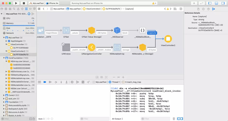 (lldb) dis -s *(void**)(0x600002f51110+16)MyLoadTest`__27-[ViewController2 loadView]_block_invoke: 0x10c79c080 <+0>: pushq %rbp 0x10c79c081 <+1>: movq %rsp, %rbp 0x10c79c084 <+4>: subq $0x40, %rsp 0x10c79c088 <+8>: movq %rdi, -0x8(%rbp) 0x10c79c08c <+12>: movq %rdi, %rax 0x10c79c08f <+15>: movq $0x0, -0x10(%rbp) 0x10c79c097 <+23>: leaq -0x10(%rbp), %rcx 0x10c79c09b <+27>: movq %rdi, -0x20(%rbp)