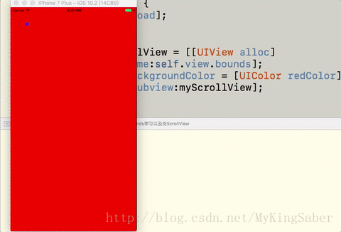 - (void)viewDidLoad { [super viewDidLoad]; // 仿scrollView UIView *myScrollView = [[UIView alloc] initWithFrame:self.view.bounds]; myScrollView.backgroundColor = [UIColor redColor]; [self.view addSubview:myScrollView]; // 滑動手勢 UIPanGestureRecognizer *pan = [[UIPanGestureRecognizer alloc] initWithTarget:self action:@selector(panGes:)]; [myScrollView addGestureRecognizer:pan]; // scrollView的內(nèi)容 UIView *blueView = [[UIView alloc] initWithFrame:CGRectMake(50, 50, 10, 10)]; blueView.backgroundColor = [UIColor blueColor]; [myScrollView addSubview:blueView];}- (void)panGes:(UIPanGestureRecognizer *)gesture{ UIView *myScrollView = gesture.view; // 獲取滑動的位移量 CGPoint transPoint = [gesture translationInView:myScrollView]; NSLog(@"%@",NSStringFromCGPoint(transPoint)); // 這里總感覺寫錯了,我腦子笨,有點繞不過來了。頭疼 CGRect bounds = myScrollView.bounds; bounds.origin.x -= transPoint.x; bounds.origin.y -= transPoint.y; myScrollView.bounds = bounds; // 復(fù)位 [gesture setTranslation:CGPointZero inView:myScrollView];}