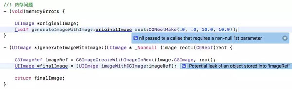 雖然ARC幫助開發者管理了大部分的內存問題。但像CGImageRef等C系列的代碼還需要開發者管理內存。這些內存問題在編譯過程中很難發現,但使用Analyze可以給出相應的提示。圖示如下:
