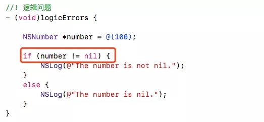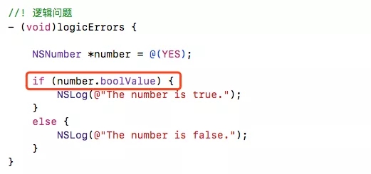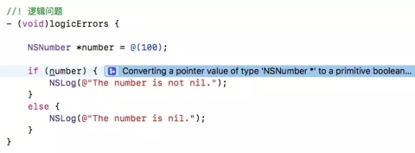 使用Analyze可以分析出來代碼中潛在的邏輯問題。比如直接使用NSNumber的對象作為條件時,會得到提示Converting a pointer value of type 'NSNumber *' to a primitive boolean value; instead, either compare the pointer to nil or call -boolValue。圖示如下: