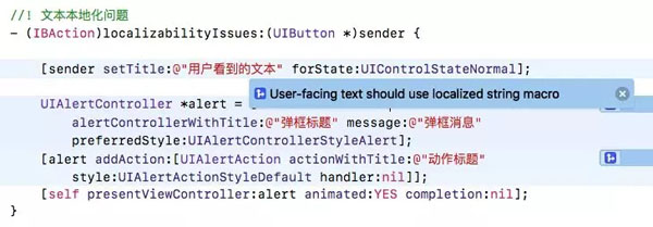 當工程Target -> Build Settings -> Static Analyzer下的Missing Localizability設置為YES時,使用Analyze功能后可以發現一些控件會提示文本本地化問題User-facing text should use localized string macro。圖示如下: