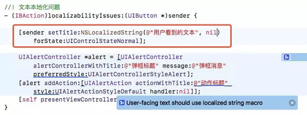 按照提示,使用NSLocalizedString(<#key#>, <#comment#>)修飾文本即可修復,圖示如下: