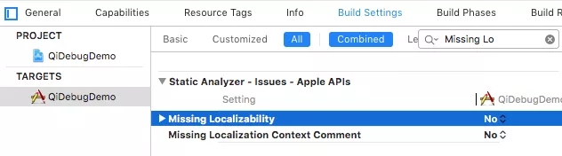 或者,將Missing Localizability設置為NO也可以。圖示如下: