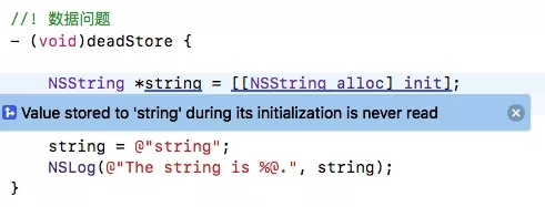 上圖中的string被提示在初始化后從未被用到。是因為第二部的賦值操作為string重新申請了內存。這時,開發者去掉第一步初始化方法即可。圖示如下: