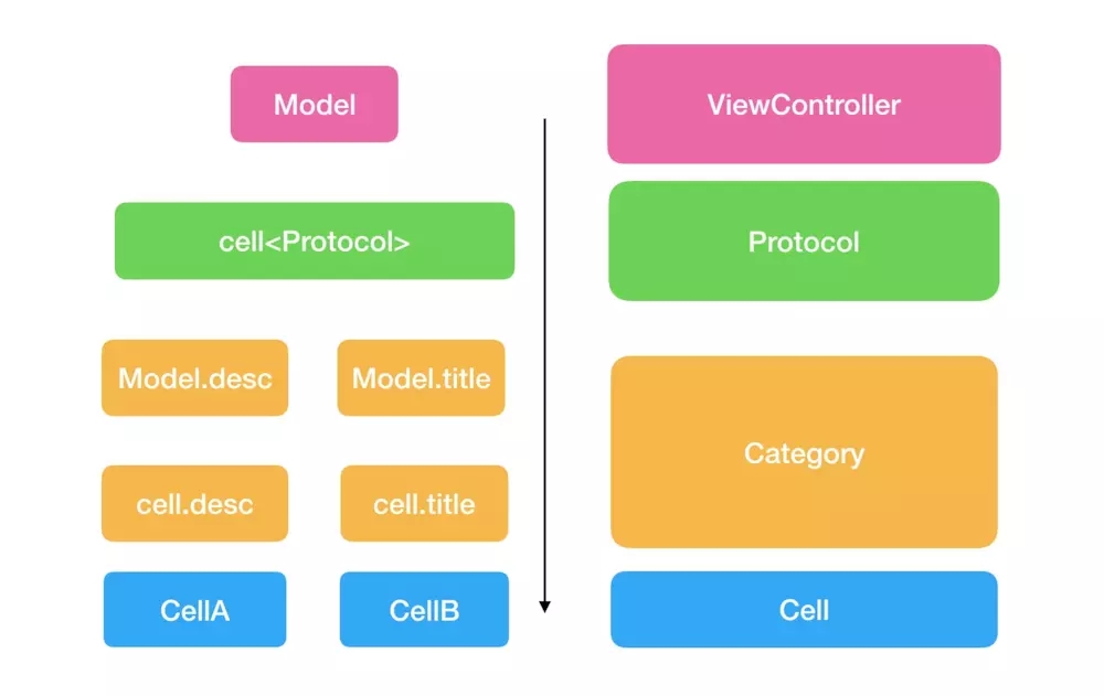 //cell共同遵循這個協議@protocol ModuleACellConfigPropotol <NSObject>- (void)configCellWithModel:(KTModel *)model;@end通過協議調用方法UITableViewCell<ModuleACellConfigPropotol> * cell= [tableView dequeueReusableCellWithIdentifier:cellID];if ([cell respondsToSelector:@selector(configCellWithModel:)]) { [cell configCellWithModel:model];}