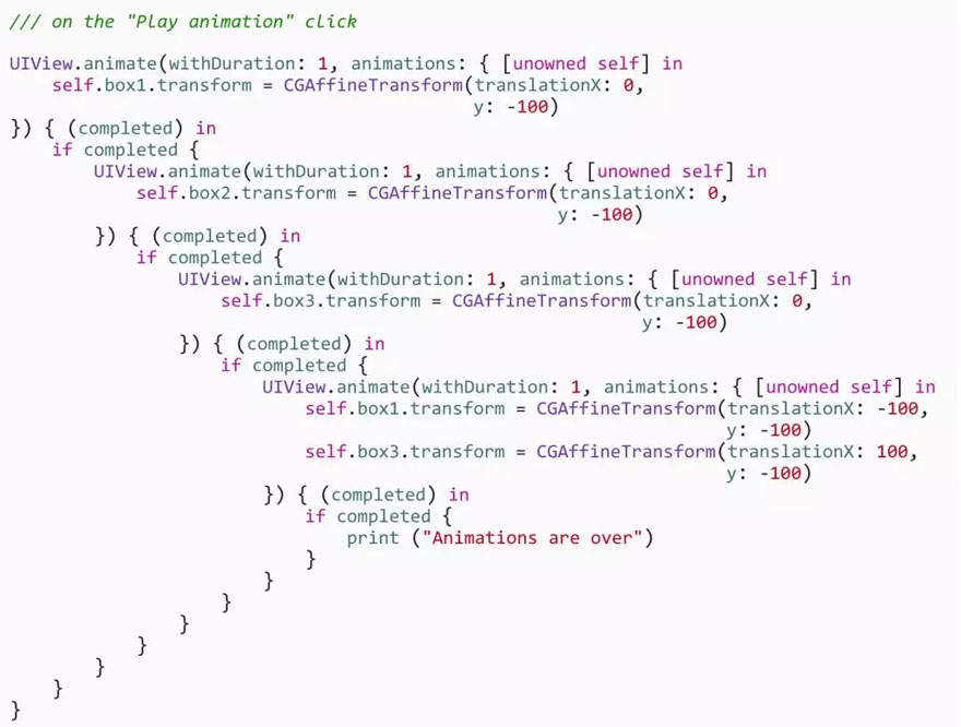 提供了一個完成block回調,我們可以用它來觸發下一個動畫。這樣做,我們可以實現這個動畫。正如你可以看到的,這坨代碼的主要缺點是丑陋,幾乎沒有可讀性。