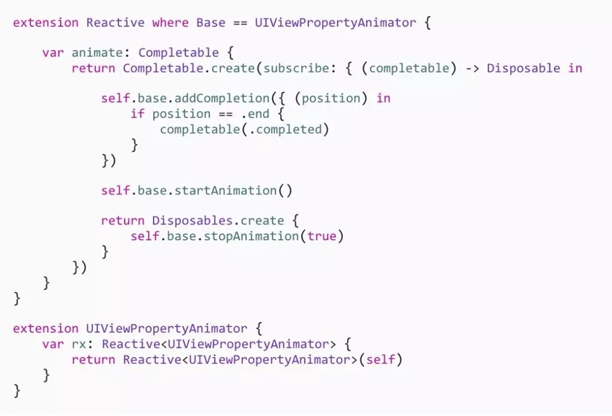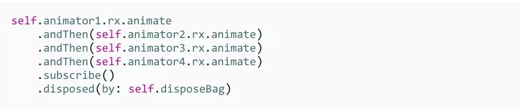 上面動畫擴展返回一個 Completable狀態 ,訂閱時,將開始動畫和添加完成回調,發送一個“.completed”事件。目的很簡單:當完成動畫,開始執行下一個開始動畫,代碼如下。