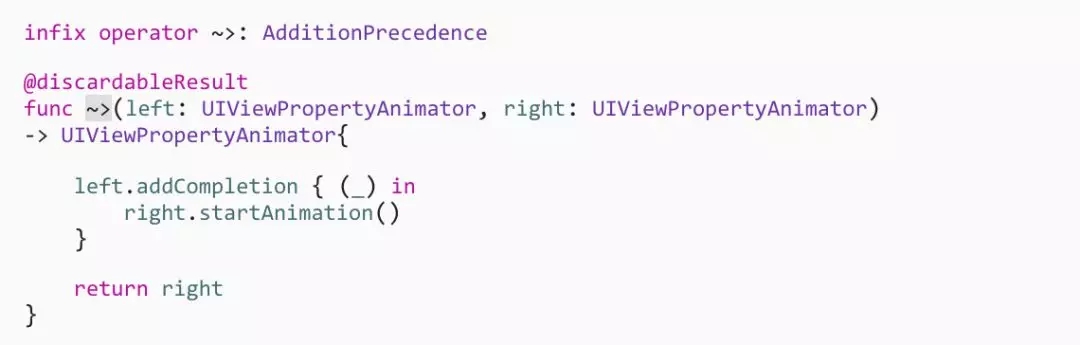 我們都知道Swift有很cool的特性:自定義操作符,我們總希望把代碼些簡單,讓別的同事看自己的代碼時一目了然,都不需注釋就懂什么意思,比如: