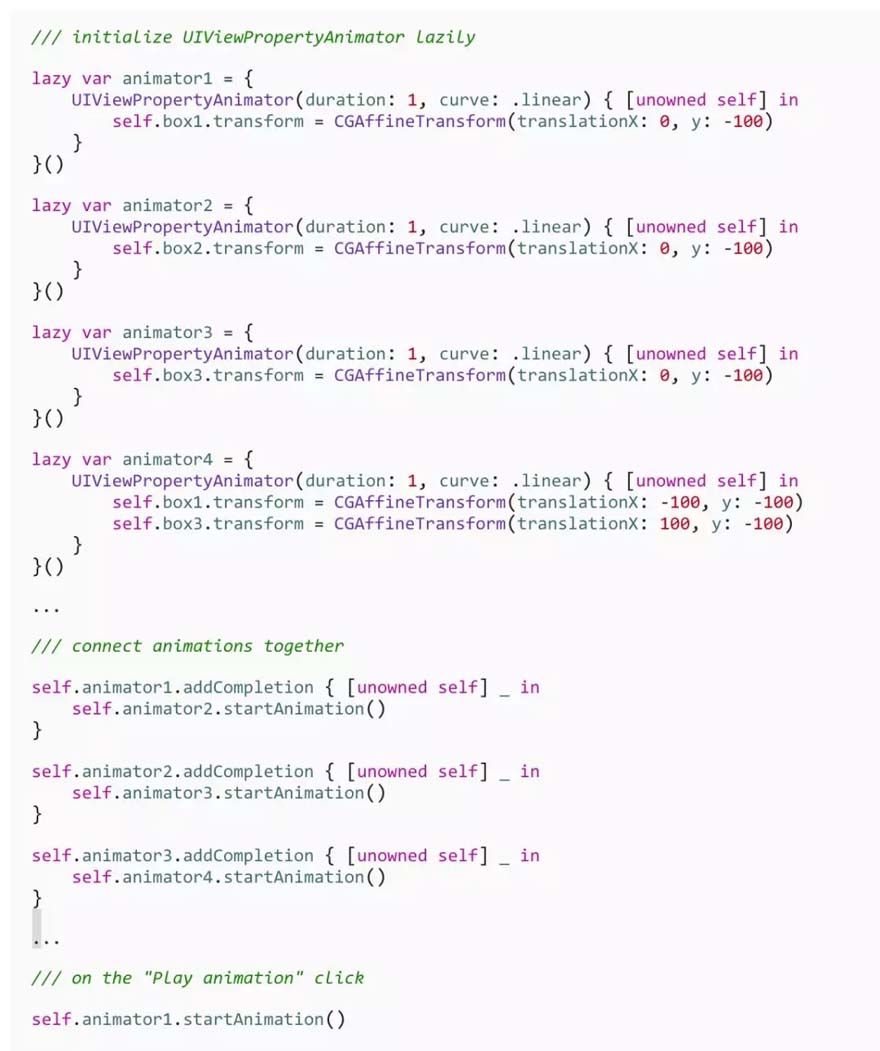 iOS10引入了UIViewPropertyAnimator ,基于篇幅原因,這里不對其做詳細介紹,如果需要讀者請自行補腦。我關心的是如何提高這類多層嵌套代碼的可讀性,通過UIViewPropertyAnimator,前面的代碼片斷將成為: