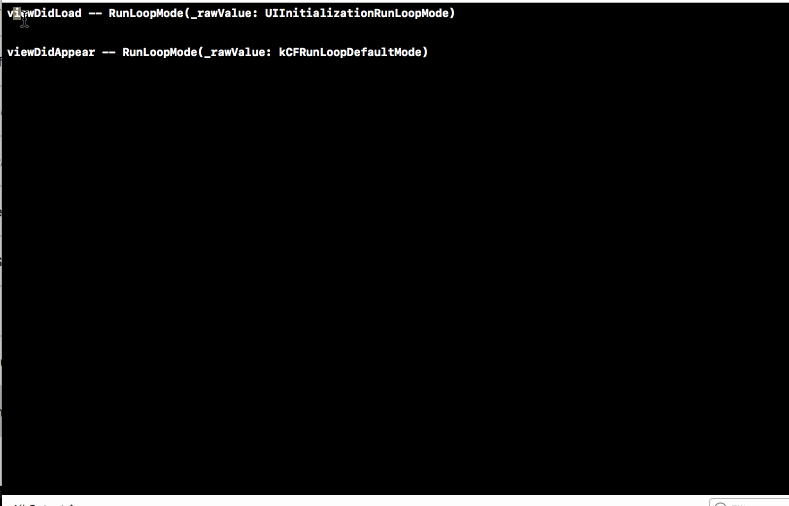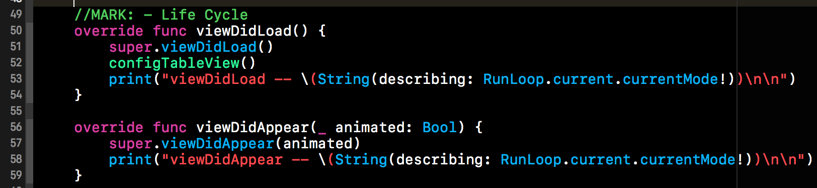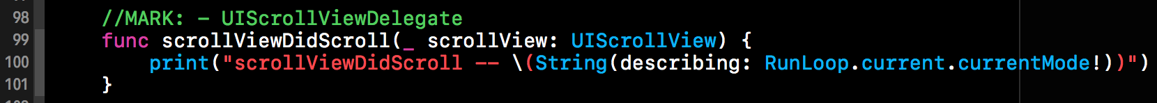 為了進一步看一下Mode的切換,我們可以在相應的地方獲取當前線程的RunLoop并且打印對應的Mode。下方代碼就是在TableView所對應的VC上添加的,我們在viewDidLoad()、viewDidAppear()以及scrollViewDidScroll()這個代理方法中對當前線程所對應的RunLoop下的currentMode進行了打印,其代碼如下。