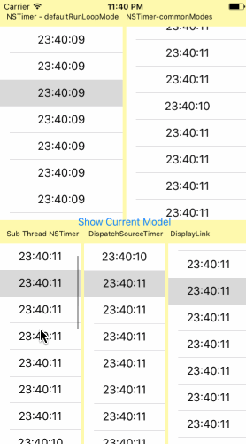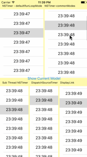 從該運行效果我們不難發現,當該TableView滾動式,其Cell上的定時器是可以正常工作的。但是當我們滑動右上角的這個TableView時,第一個的TableView中的定時器也是不能正常工作的,因為這些TableView都在主線程中工作,也就是說這些TableView所在的RunLoop是同一個。