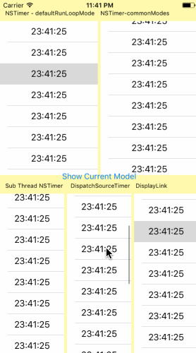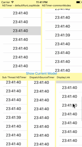 上一部分的定時器是不能正常運行的,因為NSTimer對象默認添加到了當前RunLoop的DefaultMode中,而在切換成TrackingRunLoopMode時,定時器就停止了工作。解決該問題最直接方法是,將NSTimer在TrackingRunLoopMode中也添加一份。這樣的話無論是在DefaultMode還是TrackingRunLoopMode中,定時器都會正常的工作。