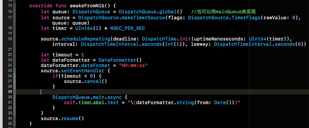 接下來我們就不使用NSTimer來實現定時器了。在之前的博客中聊GCD時其中用到了DispatchTimerSource來實現定時器。接下來我們就在TableView的Cell上添加DispatchTimerSource,然后看一下運行效果。當然下方代碼片段我們是在全局隊列中添加的DispatchTimerSource,在主線程中進行更新。當然我們也可以在mainQueue中添加DispatchTimerSource,這樣也是可以正常工作的。當然我們不建議在MainQueue中做,因為在編程時盡量的把一些和主線程關聯不太大的操作放到子線程中去做。代碼如下所示: