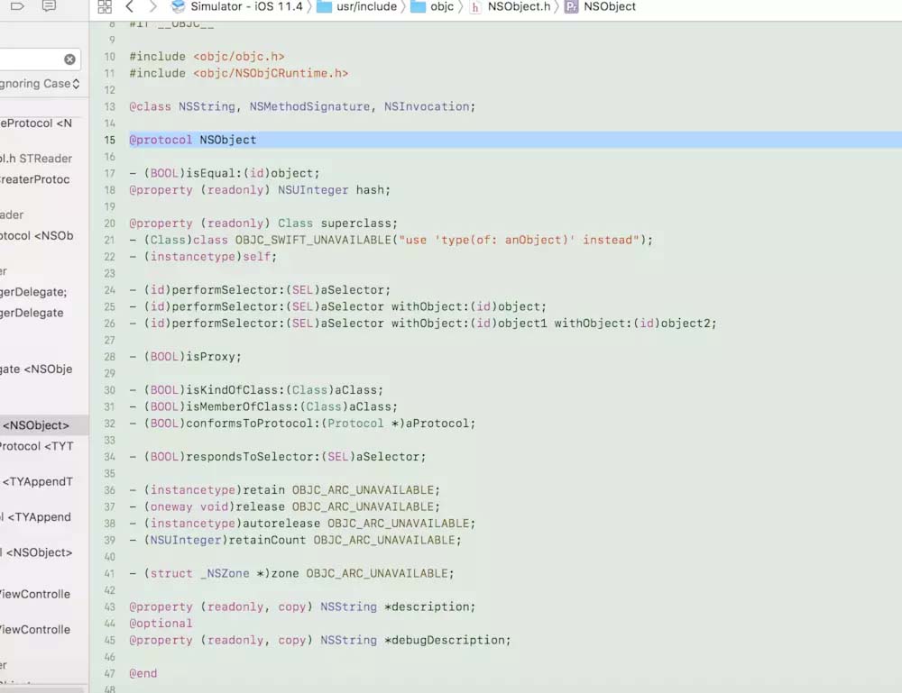 但是,NSObject不僅僅代表基類,還有協議的意思,我們可以稱之根協議,例如下圖所示: