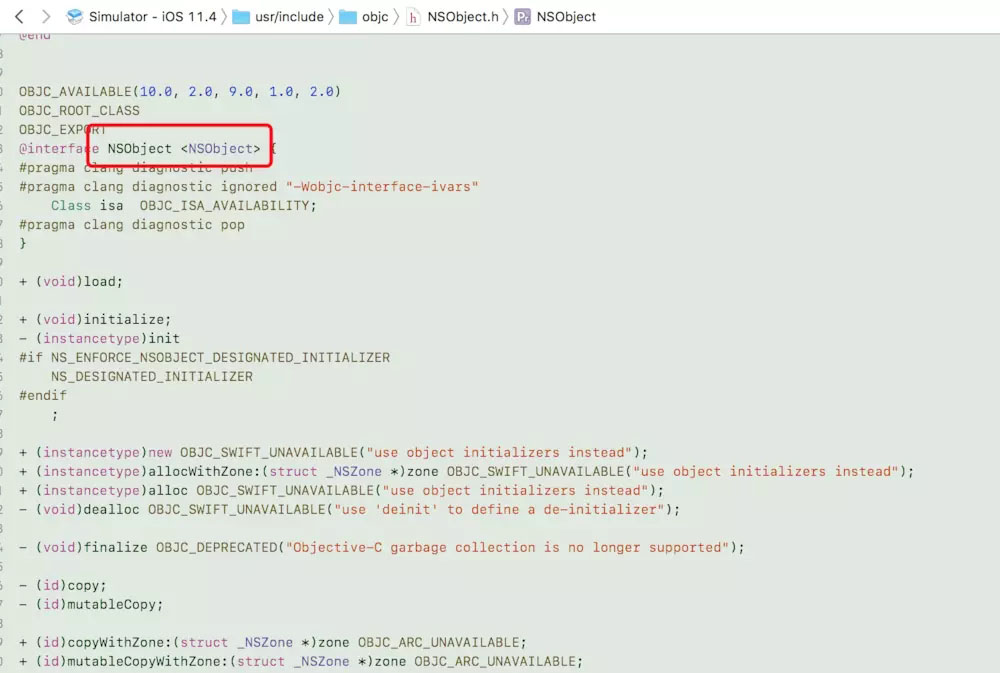 事實上,從NSObject類的定義可知,NSObject的類本身就遵循NSObject協議,如下圖所示。