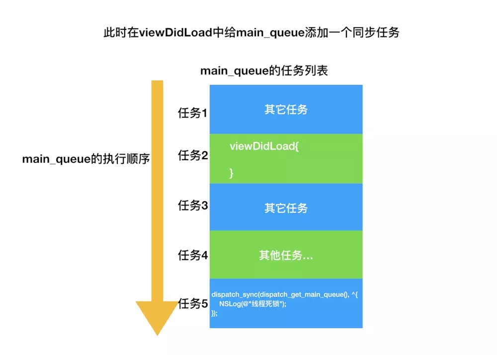 也就是說后添加的同步任務5是在viewDidLoad任務2之后,只有等待任務2執行完之后才能執行任務5,這就是串行隊列的特點。但是任務5是一個同步任務,必須等任務5執行完才能執行其它任務,因此造成互相等待的死鎖。