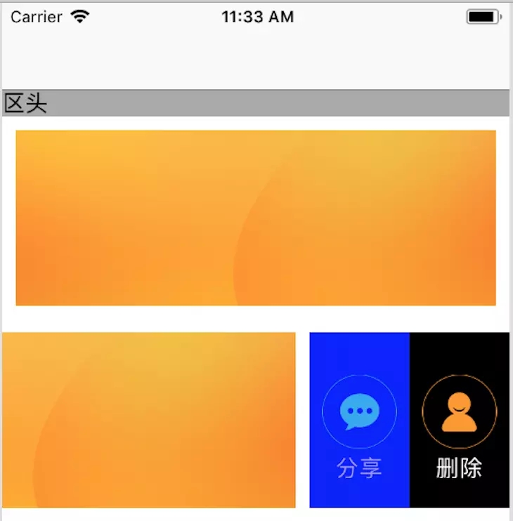 雖然這樣能基本實現功能,但是我們發現右邊的按鈕和左邊的黃色區域的高度并不一樣。這是因為右邊按鈕是和UITableViewCell的高度一致,而左邊的黃色區域只是一張圖片而已,其高度設置和UITableViewCell的高度并不一致,才會導致這樣的布局出現。如果我們想要刪除按鈕和左邊圖片一樣的高度,那我們就需要自定義刪除按鈕的高度了。