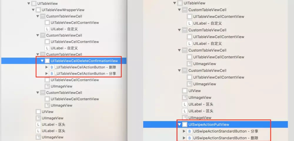 (1).iOS10下視圖層次為:UITableView -> UITableViewCell -> UITableViewCellDeleteConfirmationView -> _UITableViewCellActionButton,我們所需自定義的按鈕視圖UITableViewCellDeleteConfirmationView(左圖中紅框處)是UITableViewCell的子視圖。