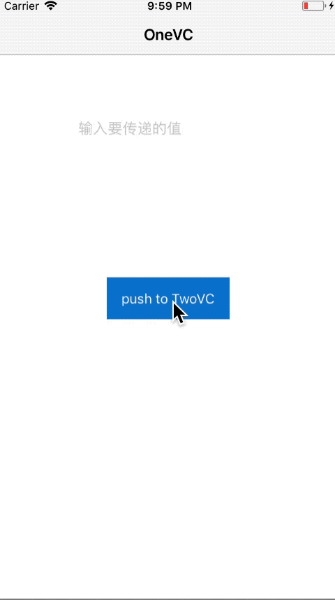 #import "OneViewController.h"#import "TwoViewController.h"@interface OneViewController ()@property (weak, nonatomic) IBOutlet UITextField *oneTextF;@end@implementation OneViewController- (void)viewDidLoad { [super viewDidLoad]; self.navigationItem.title = @"OneVC";}- (IBAction)pushToTwoVC:(id)sender{ TwoViewController *twoVC = [[TwoViewController alloc] init]; // 重點!給 TwoViewController 的 value 屬性賦值 twoVC.value = _oneTextF.text; [self.navigationController pushViewController:twoVC animated:YES];}@end
